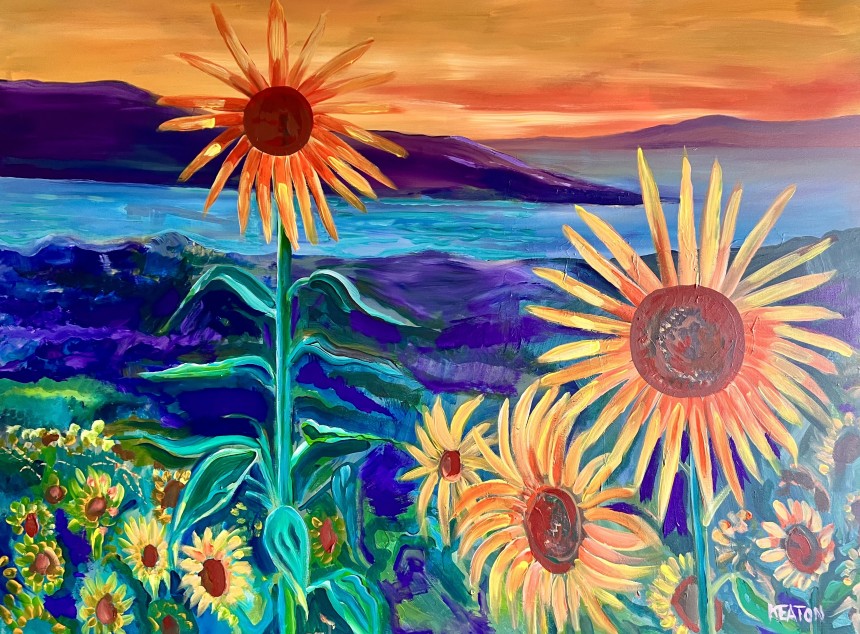 Beautifully Bold and Brazen Yellow Sunflowers growing along a coastline at sunrise.