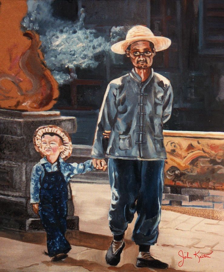 A lovely oil painting that depicts a Father taking his young son out for a stroll