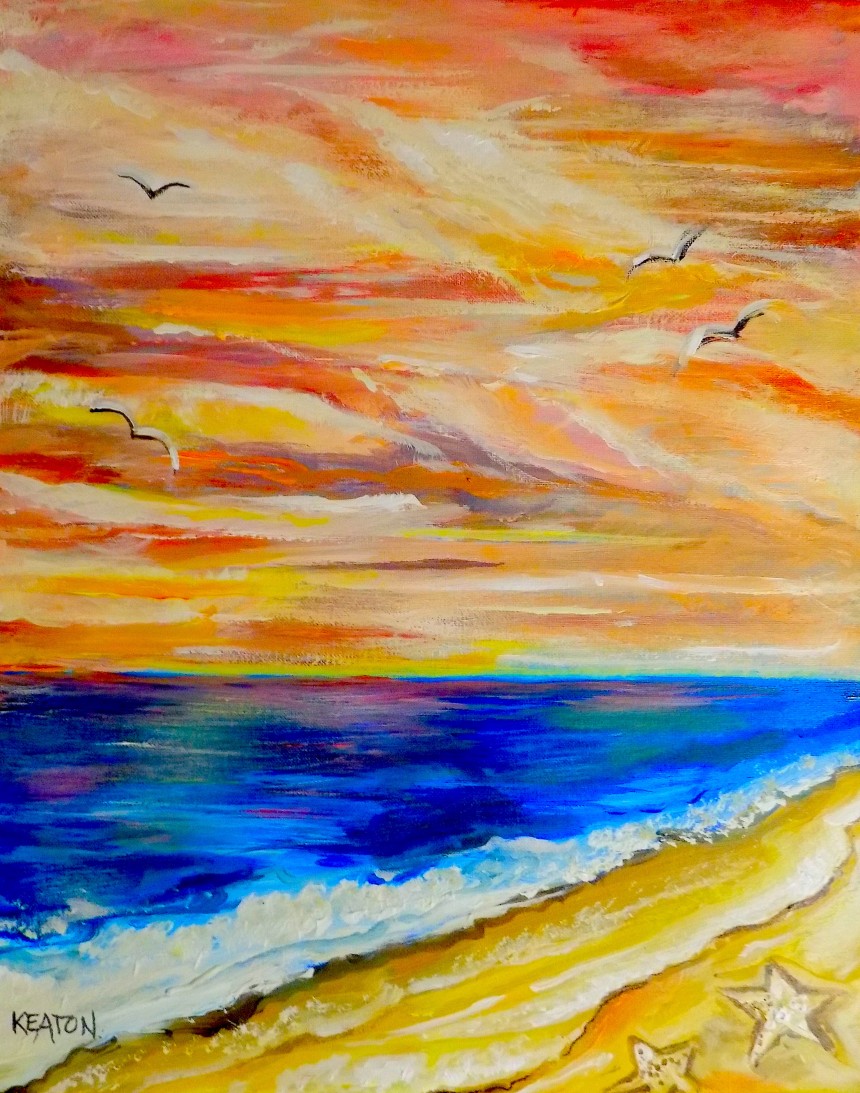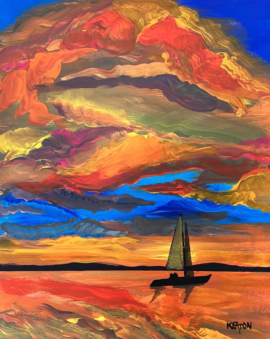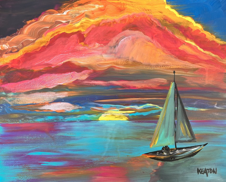 An opulent sunrise is the focus on this seaside work. A sailboat rides along the coast in this Beautiful scene