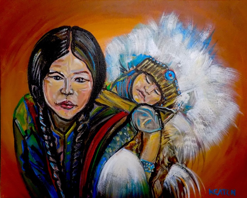 An Indian Maiden carries her young baby on a papoose on her back. A wonderful depiction of Mother and Child in an ethnic Culture