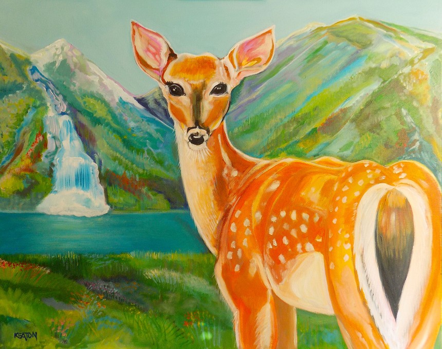 Another Day is Dawning - A Doe surveys the territory - a dazzling waterfall in a lush mountain setting