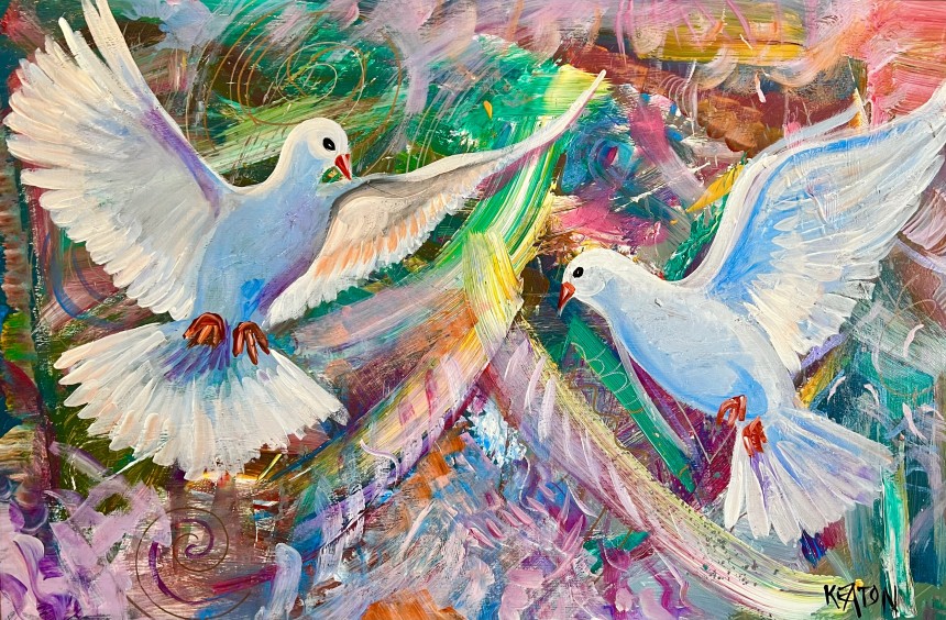 The flight of two magnificent doves hovering against a symphony of colors in the background