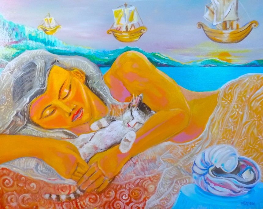 A dreamlike painting which features a beautiful Indian Maiden asleep and dreaming of three floating ships above her